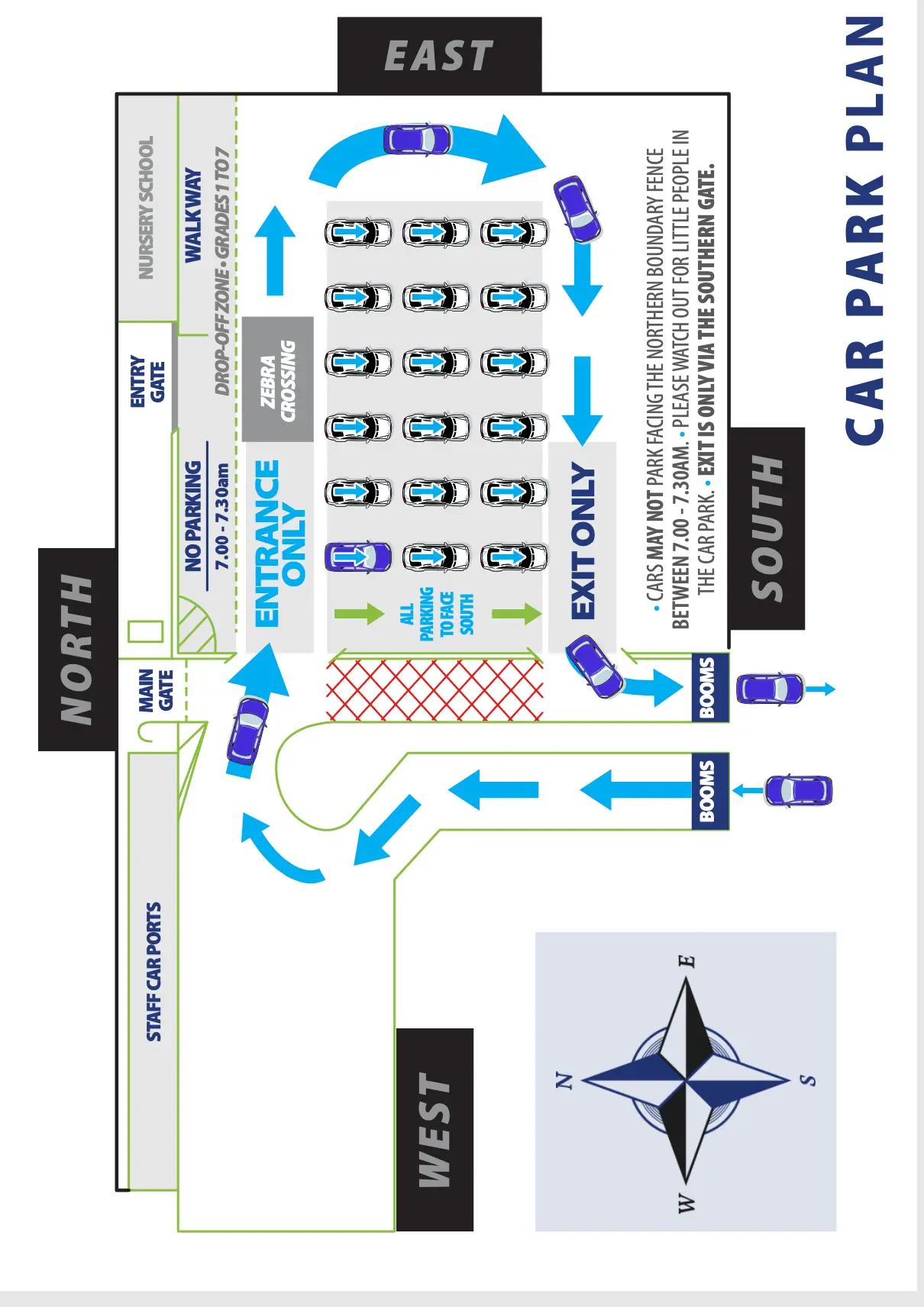 It is important for your child’s safety that you use the entry and exit into the school car park correctly. Refer to our map below